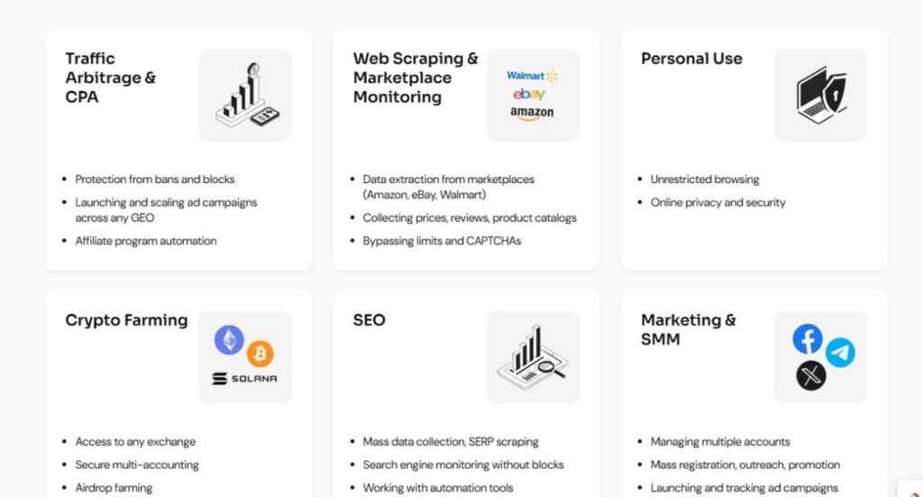 - Residential proxies: Ideal for social networks and platforms like Meta/TikTok. Real user IPs boost trust during campaign launches.