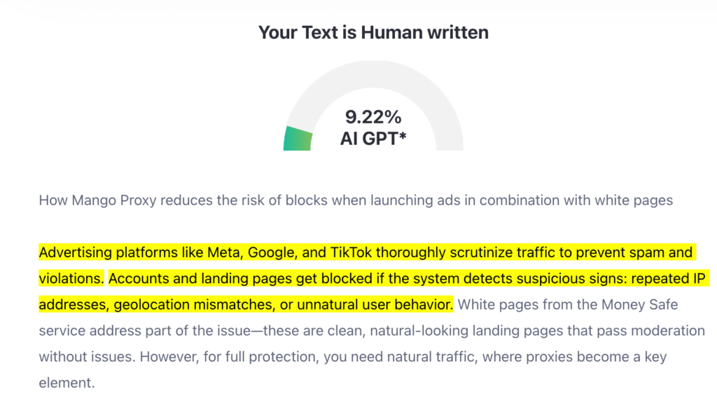 Advertising platforms like Meta, Google, and TikTok thoroughly scrutinize traffic to prevent spam and violations. Accounts and landing pages get blocked if the system detects suspicious signs: repeated IP addresses, geolocation mismatches, or unnatural user behavior. White pages from the Money Safe service address part of the issue—these are clean, natural-looking landing pages that pass moderation without issues. However, for full protection, you need natural traffic, where proxies become a key element.