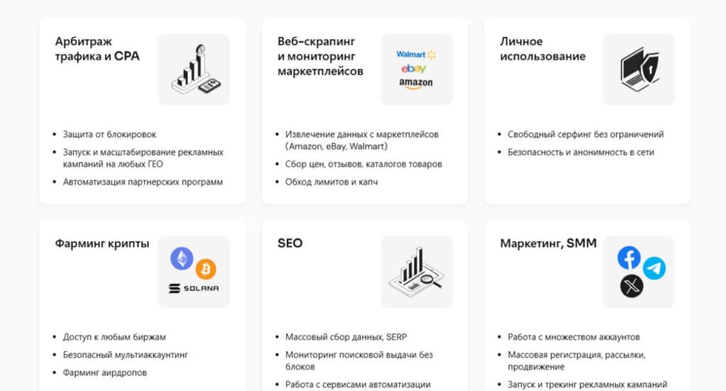 - Стабильность в рекламных кабинетах: Sticky-сессии до 30 мин обеспечивают бесперебойную работу, без сбоев при запуске кампаний.
