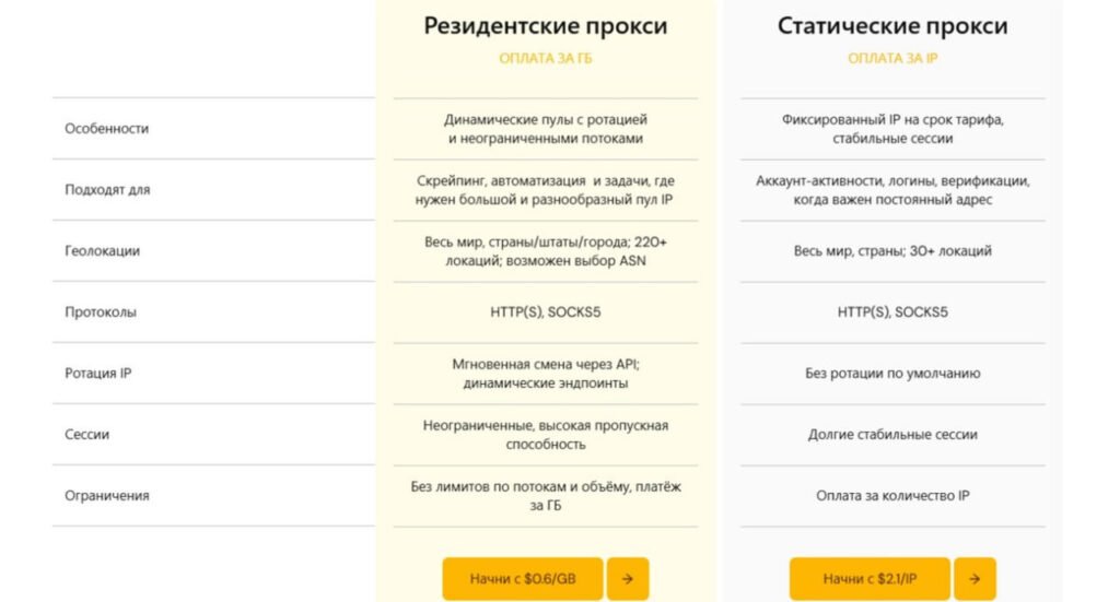 - ISP статические: Для длительных сессий и мультиаккаунтинга — стабильны, подходят для мониторинга и аналитики.